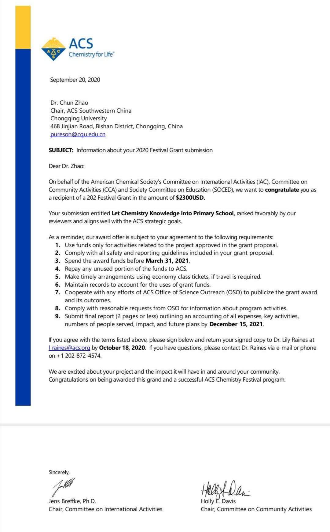 近日,伟德国际1949始于英国员工化学协会成功获得美国化学会(ACS)专项活动资金,总计2300美元。该项资金是美国化学会发放的面向高校化学社团及ACS各地分会所提供的2020年度化学节专项活动资金,由全球范围(除美国)的76所高校员工化学社团提交申请,经初步筛选后送专家匿名评审,根据评审结果最终确定全球资助名单。这笔资金将用于员工化学协会后续的系列活动支出。